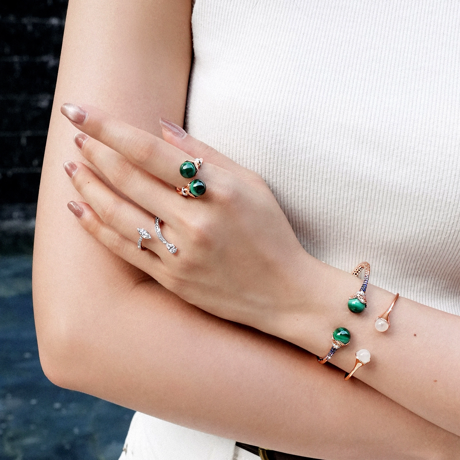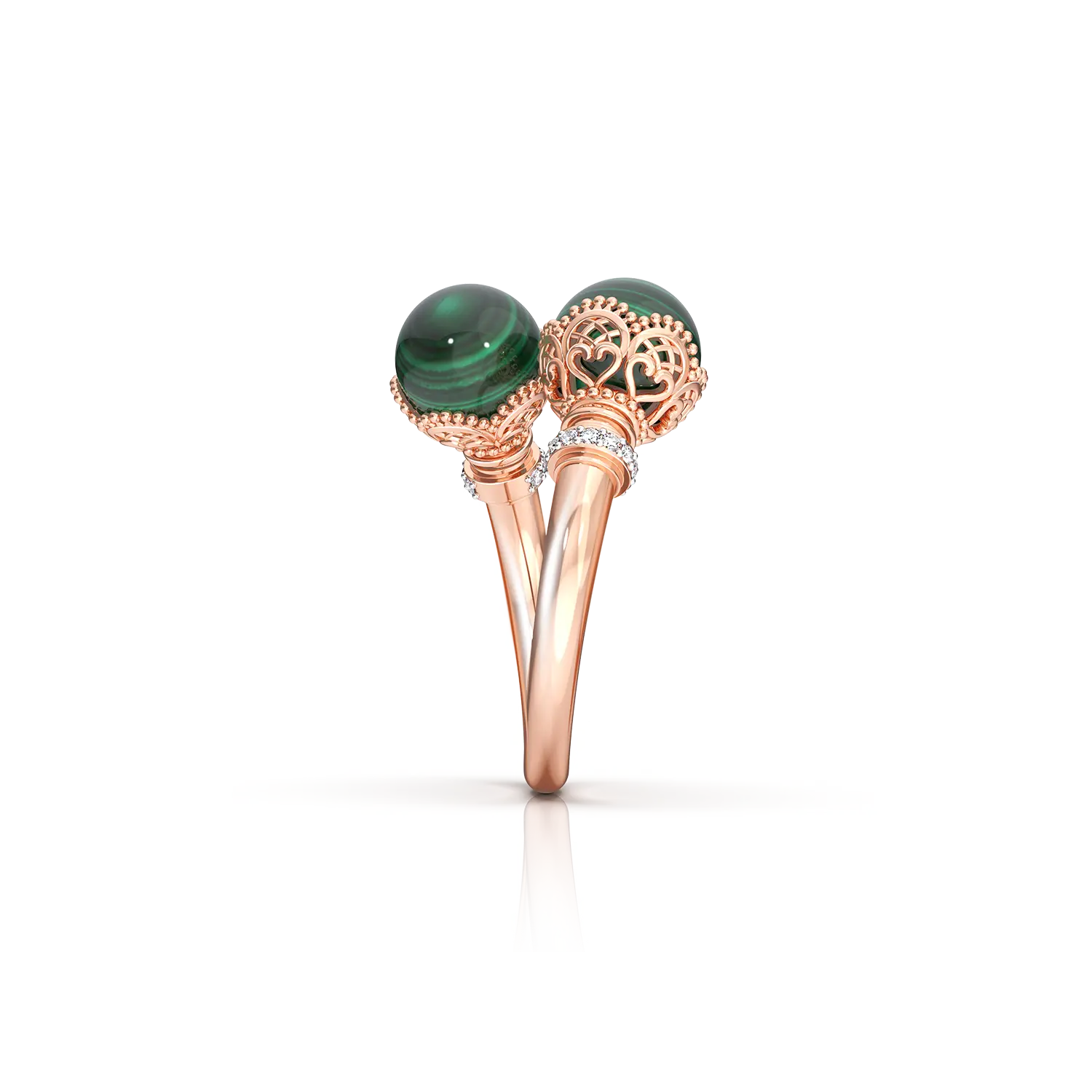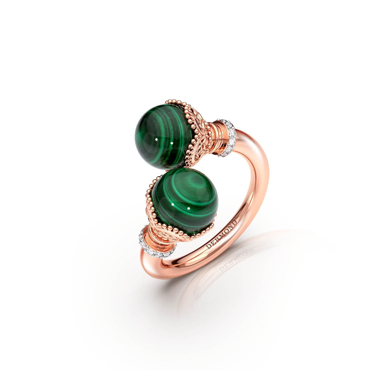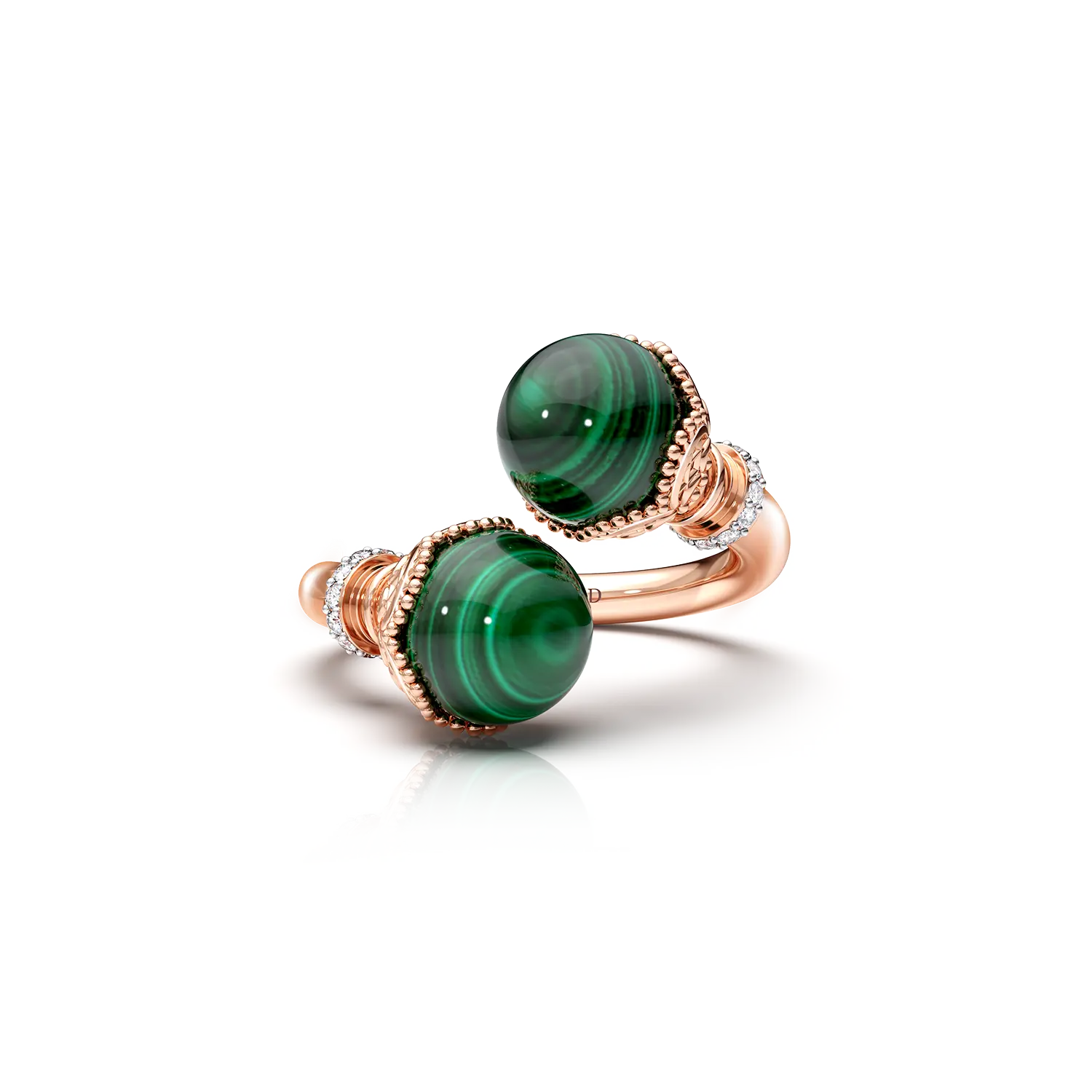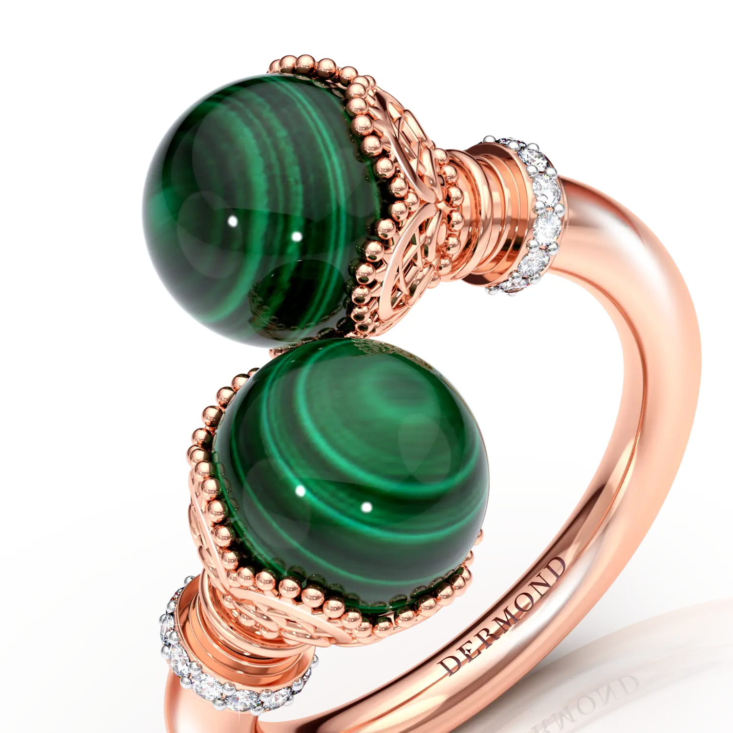 The Full Moon Ring boasts a luxurious design with graceful curves, highlighted by its unique round shape that mirrors the perfection of a full moon. Delicate lace patterns add intricate detail, while the 18K rose gold frame is polished to a radiant shine, elegantly complemented by Malachite. Perfect for any occasion that calls for luxury and distinction.