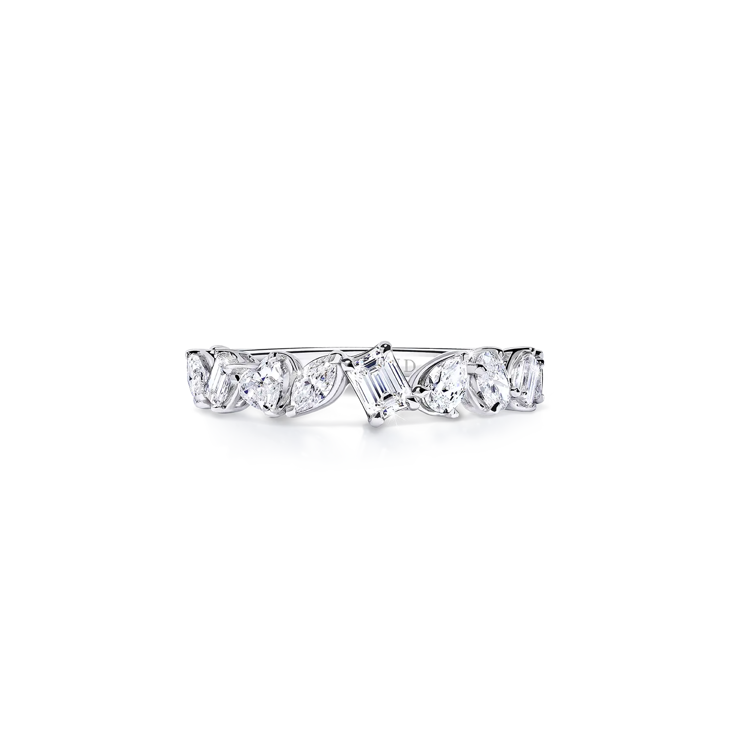The designers have meticulously arranged a variety of fancy-shaped diamonds, carefully considering size and placement to create stunning dimensions. At its heart, an emerald cut center diamond adds a distinctive brilliance, making this piece truly captivating.