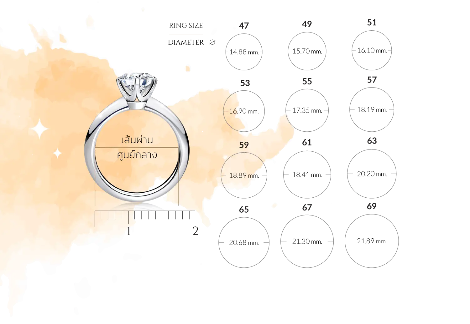 ที่สำคัญต้องเช็คก่อนนะคะว่าแหวนที่หยิบมาวัดนั้นเป็นแหวน ที่แฟนใส่นิ้วไหน เพราะขนาดของแต่ละนิ้วก็ไม่เท่ากัน วิธีการ วัดก็คือใช้ไม้บรรทัดวัดเส้นผ่านศูนย์กลางของแหวน โดยวัด จากขอบวงในสุดนำผลที่ได้มาเทียบไซส์กับรูปด้านล่างได้เลยค่ะ