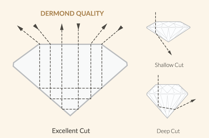 Cut is the most important factor in a diamond’s beauty, as it directly affects how light is reflected and dispersed. A perfectly symmetrical cut allows light to enter and return with exceptional brilliance, fire, and sparkle.For this reason, Dermond selects only Triple Excellent Cut diamonds – the highest grading according to international certification standards.