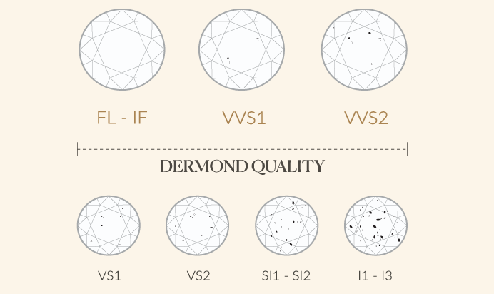 Clarity refers to the purity of a diamond and plays a vital role in its brilliance. Dermond carefully selects diamonds with in the highest clarity range – from FL (Flawless) to WS2 (Very Very Slightly Included)-ensuring that each stone used in our creations meets the most refined standards of excellence.