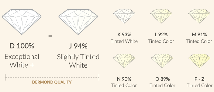 Natural diamonds exist in a variety of colors, but pure white diamonds remain the most sought after. Diamond color is graded from D (completely colorless) to Z (noticeable color presence). Dermond exclusively selects diamonds within the Colorless to Near Colorless range (D-J).We also ensure that our diamonds are free from undesirable secondary hues such as green, brown, or gray.